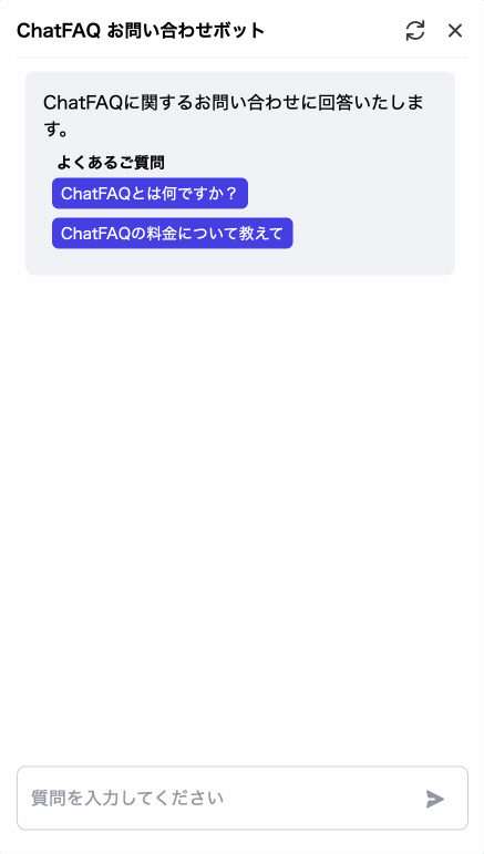 このチャットボットは、ChatFAQに関するよくある質問をまとめたドキュメントを学習して作成されました。